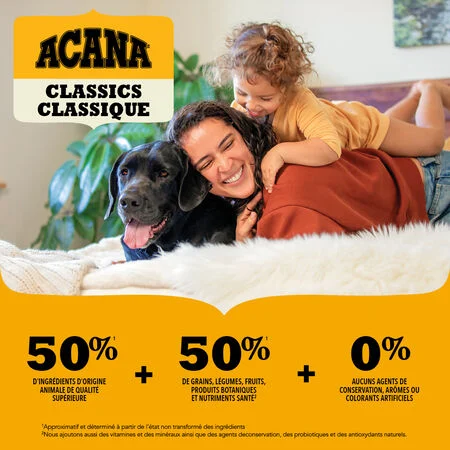 Les recettes ACANAMD sont confectionnées avec soin, du début à la fin, avec de délicieux ingrédients de qualité. Grâce à l’équilibre moitié-moitié de riches ingrédients de volaille ainsi que de fruits, de grains et de légumes nutritifs, la recette ACANA Classique Prairie Poultry offre à votre chien un repas substantiel et nutritif composé d’ingrédients simples et entiers. Elle contient également des ingrédients riches en nutriments favorisant trois grands bienfaits pour la santé, soit la fonction immunitaire, une digestion saine ainsi qu’une peau et un pelage en santé. Donnez à votre chien une nutrition de qualité supérieure à prix classique grâce à la recette ACANA Classique Prairie Poultry.