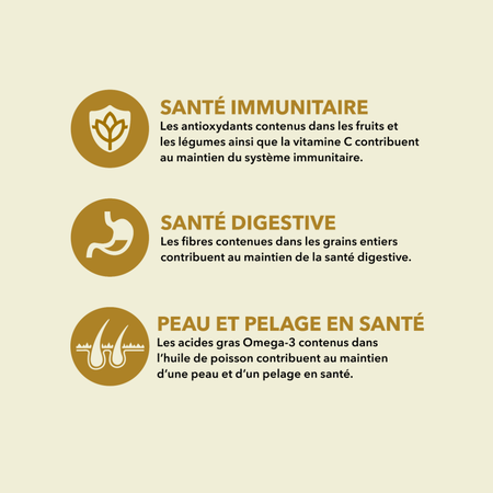 - Contenant des acides gras oméga-3 en provenance d’huile de poisson pour aider à favoriser une peau et un pelage en santé