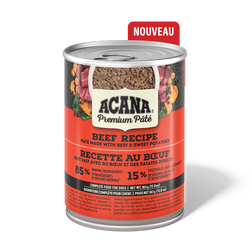 Comblez l’appétit de votre chien avec la nourriture humide pour chiens ACANA PREMIUM PÂTÉMC, qui procure nutriments et hydratation! Cette nourriture humide pour chiens de qualité supérieure procure des bienfaits à chaque bouchée, en contribuant notamment à la santé immunitaire et à la santé de la peau et du pelage. Préparée à partir d’un délicieux bouillon d’os, elle offre également une texture onctueuse et facile à manger pour les chiens. Elle contient 85 % d’ingrédients d’origine animale1 équilibrés avec 15 % de légumes, de fruits et de nutriments1,2. Et puisque nous faisons dans l’excès avec chaque ingrédient qui entre dans la composition des recettes ACANA, cette nourriture humide pour chiens est faite de bœuf riche en protéines équilibré avec des fruits et légumes nutritifs, comme des patates douces et des canneberges. Améliorez l’heure des repas de votre chien en lui servant la nourriture humide ACANA PREMIUM PÂTÉ seule ou en guise de garniture sur sa nourriture sèche préférée. Vous l’aiderez ainsi à se sentir si bien à l’intérieur que cela se verra à l’extérieur!