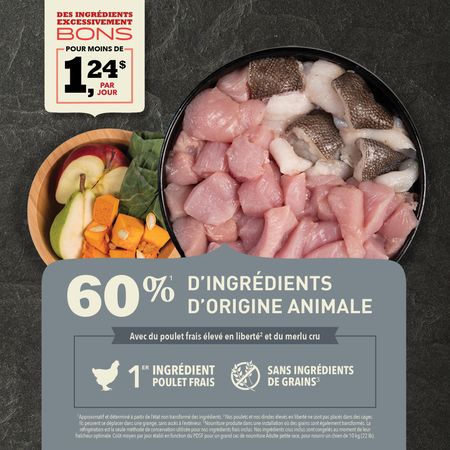 Lorsqu’il est question de la nourriture pour chiens ACANAMC, nous faisons dans l’excès avec chacun des ingrédients qui composent nos recettes de qualité supérieure fabriquées ici au Canada. C’est pourquoi notre recette pour chiens adultes de petites races est soigneusement conçue pour fournir à votre chien une alimentation riche en protéines animales, afin de répondre à ses besoins énergétiques. Composée à 60 % d’ingrédients d’origine animale de qualité, comme du poulet frais élevé en liberté et du merlu cru, et équilibrée avec 40 % de fruits et de légumes3, comme de la citrouille, des pommes, des poires et des légumes à feuilles entiers frais, cette recette fournit les nutriments et les protéines animales dont votre chien de petite race a besoin pour vivre pleinement. Nous faisons confiance à des fournisseurs que nous connaissons bien et en qui nous avons confiance, et nos vétérinaires et experts en nutrition animale élaborent soigneusement chaque recette pour faire en sorte que votre animal se sente si bien à l’intérieur que cela se verra à l’extérieur. Nous faisons confiance à des fournisseurs que nous connaissons bien et en qui nous avons confiance, et nos vétérinaires et experts en nutrition animale élaborent soigneusement chaque recette pour faire en sorte que votre animal se sente si bien à l’intérieur que cela se verra à l’extérieur.