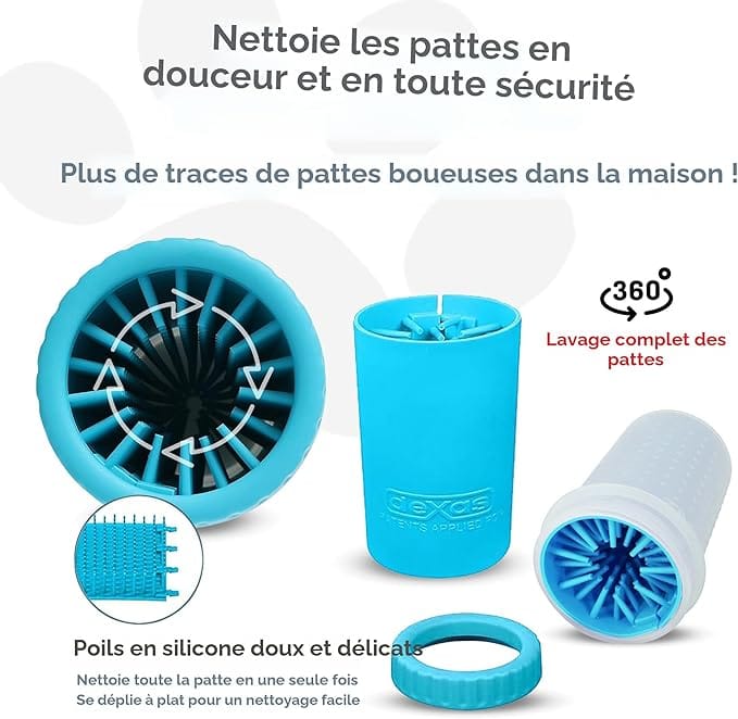 - Pour l’utiliser, ajoutez un peu d’eau, insérez la patte boueuse, faites tourner un peu, essuyez la patte, répéter l’opération pour les 3 autres pattes