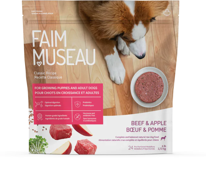Chaque famille a ses classiques culinaires. Chez Faim Museau, il s’agit de notre formule Bœuf & Pomme. Une recette qui met en vedette du bœuf 100 % canadien et des pommes, un fruit reconnu pour aider la santé digestive. Plus calorique, cette formule est tout indiquée pour les chiens actifs et les chiots en croissance. Riche en protéines, le bœuf est une excellente source de fer, de zinc, de vitamines du complexe B et d’acides aminés. Des nutriments qui fournissent de l’énergie, protègent le système immunitaire et aident à renforcer la musculature. Format : 6 lb / 24 médaillons