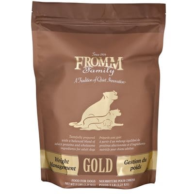 La nourriture Fromm Gold Gestion du poids pour chiens est formulée pour procurer une nutrition complète et équilibrée aux chiens adultes moins actifs.