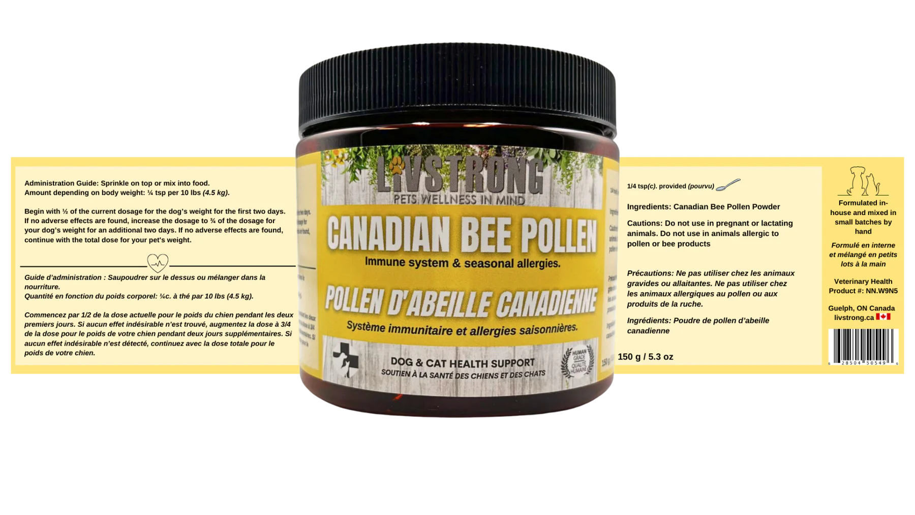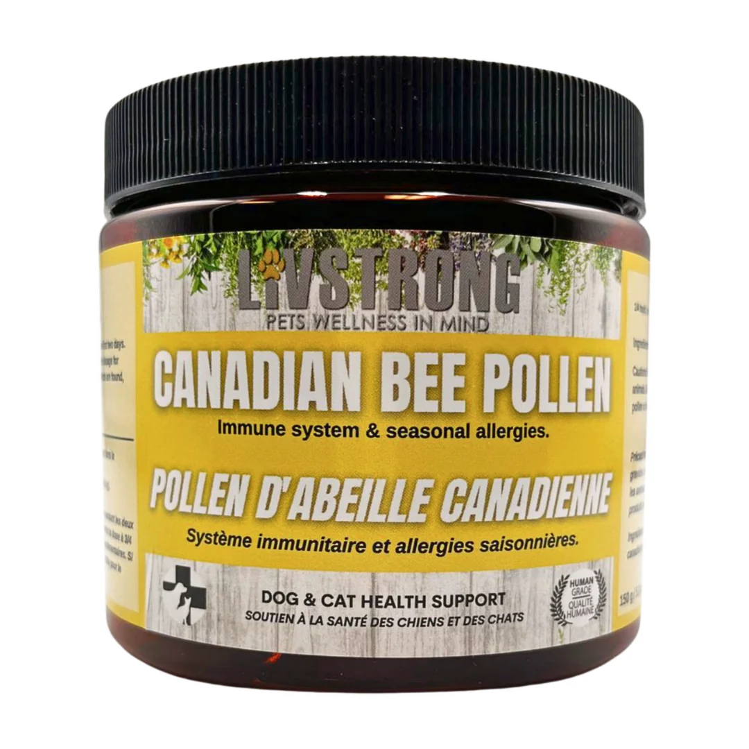 Le pollen d’abeille réduit de manière impressionnante les symptômes d’allergies saisonnières et les réactions allergiques. Il contient également une variété d’acides gras essentiels ; les plus prédominants sont les acides gras oméga 3 et oméga 6. Le pollen d’abeille contient également de la quercétine, un antihistaminique naturel. L’ajout de pollen d’abeille à l’alimentation de votre chien peut aider à réduire les symptômes et les réactions allergiques tout en favorisant un système immunitaire sain. Il est antimicrobien, antifongique et antiviral et améliore le flux sanguin vers le système nerveux, aidant ainsi à soulager le stress et l’anxiété. Soutient les besoins énergétiques et la digestion de votre animal. Gramme pour gramme, il contient plus d’acides aminés que le bœuf, le poisson ou les œufs. Nous l’avons emballé dans un pot noir recyclable avec 1/4 de cuillère à café pour un service facile.