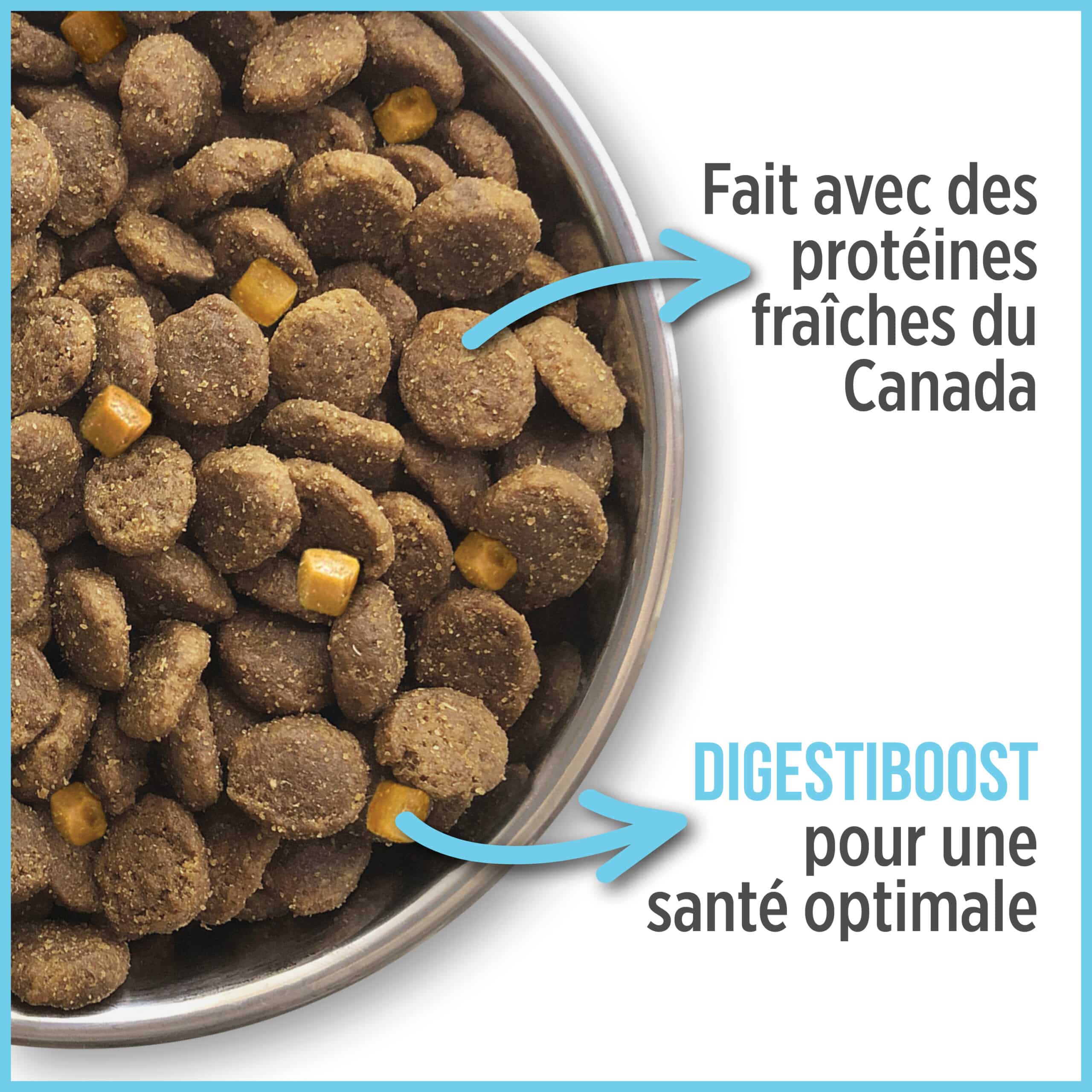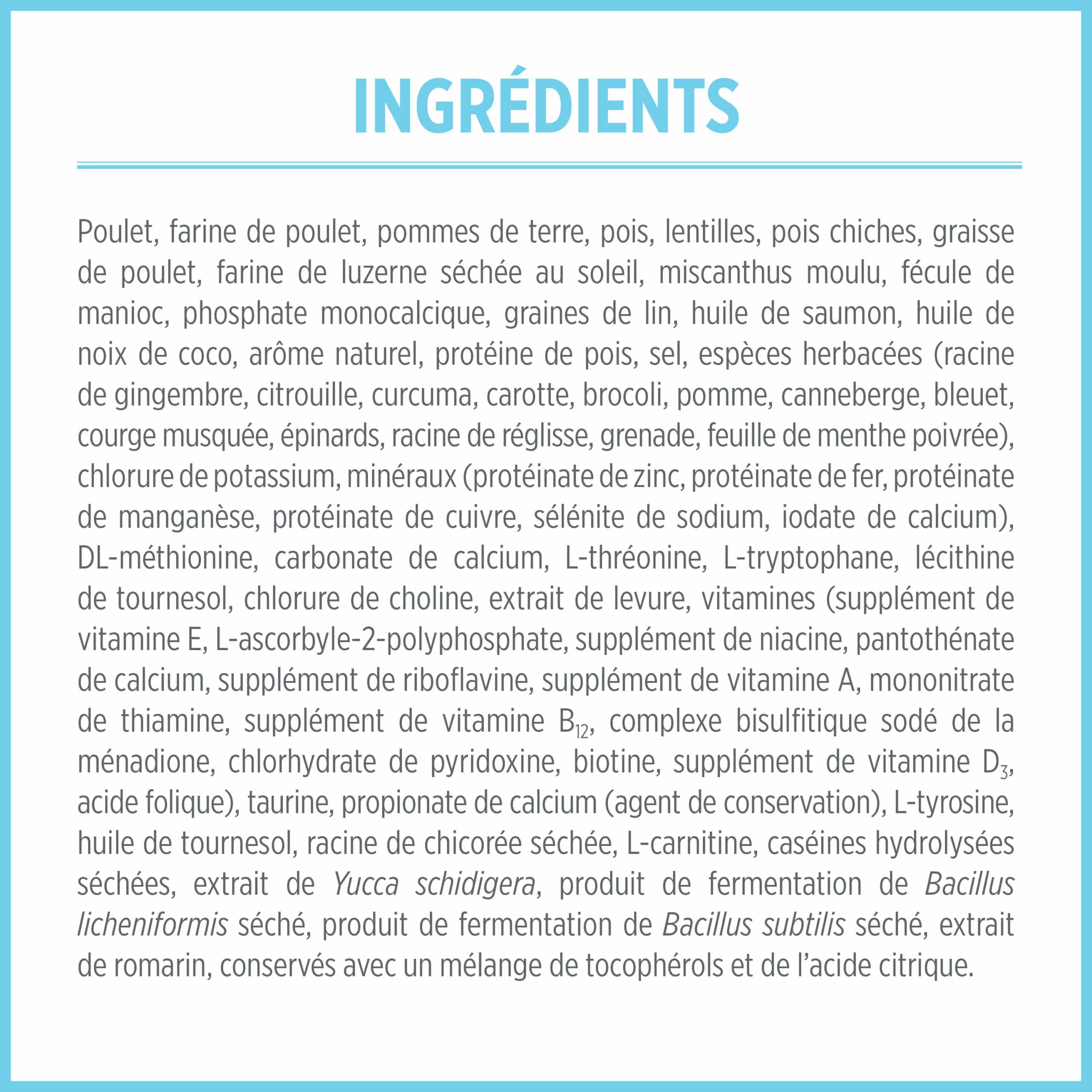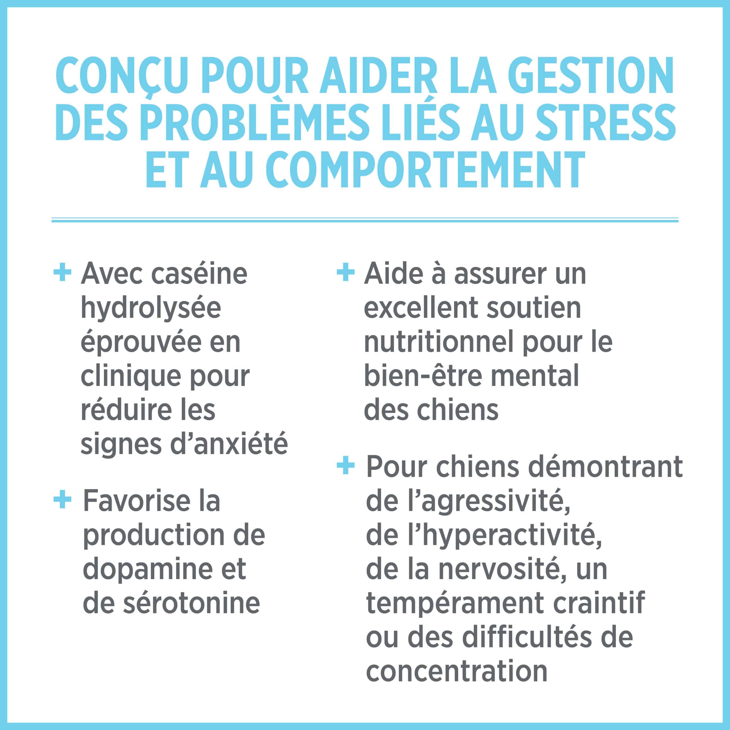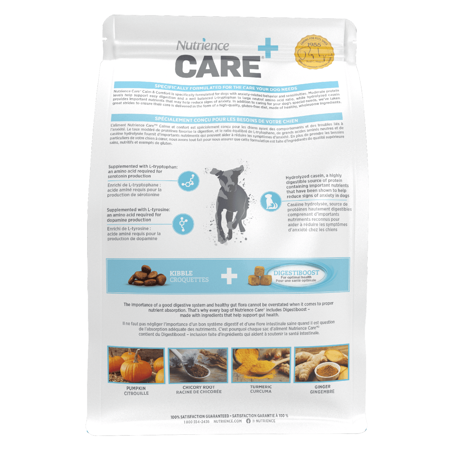 La formulation Nutrience Care Calme et confort pour chiens comprend un taux modéré de protéines, y compris un concentré de protéines de lactosérum et de caséines hydrolysées pour réduire la stimulation du corps en général.