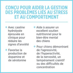 La formulation Nutrience Care+ Calme et confort pour chiens comprend un taux modéré de protéines, y compris un concentré de protéines de lactosérum et de caséines hydrolysées pour réduire la stimulation du corps en général.