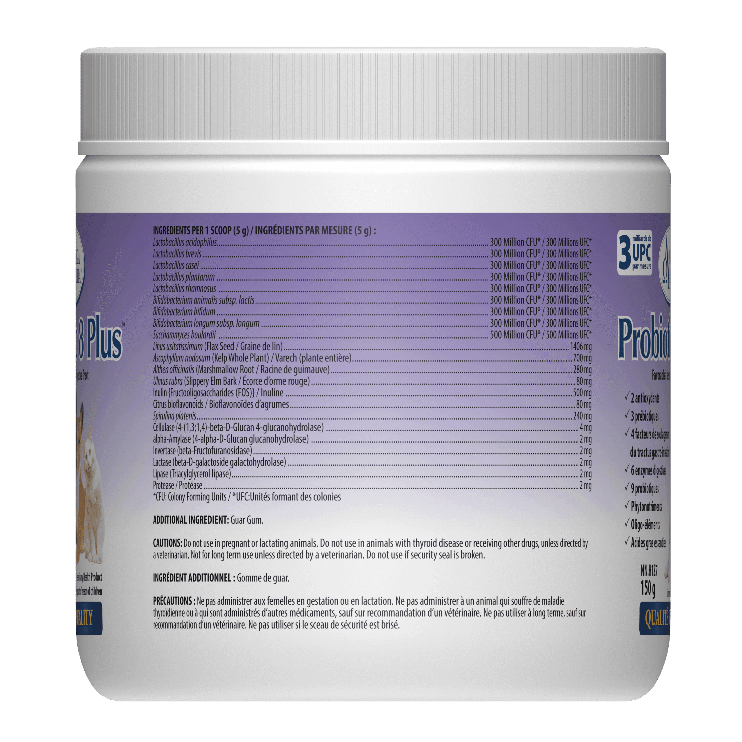 Tout comme les humains, votre animal de compagnie peut souffrir de malaises digestifs. Les intolérances et allergies alimentaires ainsi que la piètre qualités de certains aliments du commerce pour animaux familiers et d’autres facteurs peuvent contribuer à une mauvaise digestion, aux gaz et au ballonnement. L’utilisation quotidienne de Probiotic 8 Plus assure à votre compagnon animal une digestion optimale.